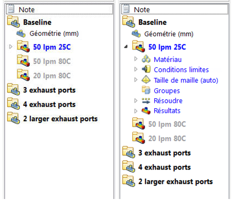 Une étude de conception contient au moins une conception (géométrie de CAO spécifique) et une conception contient au moins un scénario (ensemble de matériaux, conditions limites et paramètres de maillage, avec les résultats d'analyse associés). Les conceptions sont indiquées en lettres noir gras et les scénarios en lettres bleu gras . Les affectations de configuration et les résultats sont indiqués en lettres bleu fin dans chaque scénario. Gérez les analyses à partir de cette fenêtre.