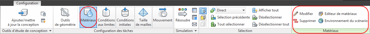 Par exemple, lorsque la tâche Matériaux est active sur l'onglet Configuration, le panneau contextuel Matériaux s'affiche :