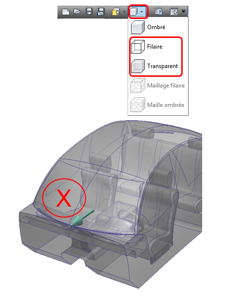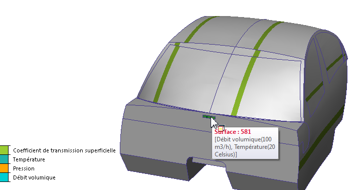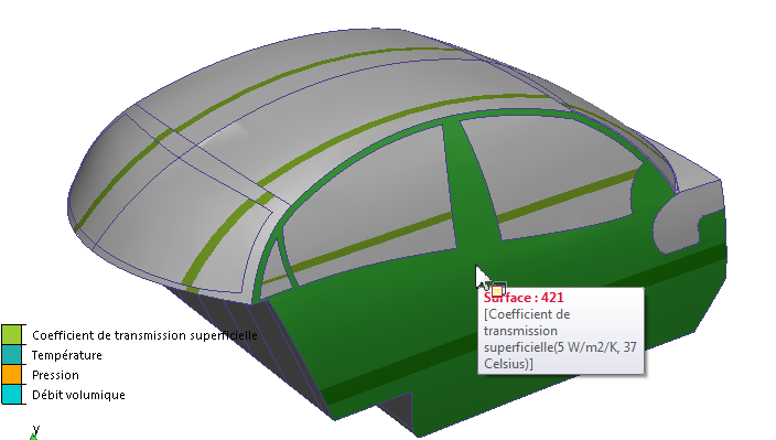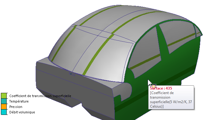 13. Pour simuler le comportement d'un véhicule stationnaire dans des conditions chaudes, appliquez un coefficient de transmission superficielle sur les côtés et en haut de l'habitacle. Sélectionnez les surface suivantes et cliquez sur le bouton Modifier de la barre d'outils contextuelle :
