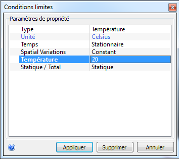 14. Type = Coefficient de transmission superficielle, Unités de coefficient = W/m2/K, Coefficient de transmission superficielle = 5, Unités de température = Celsius, Température réf = 37. Cliquez sur Appliquer .