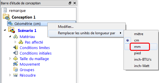 1. Vérifiez que les unités sont réglées sur mm dans la branche Géométrie de la barre Etude de conception.