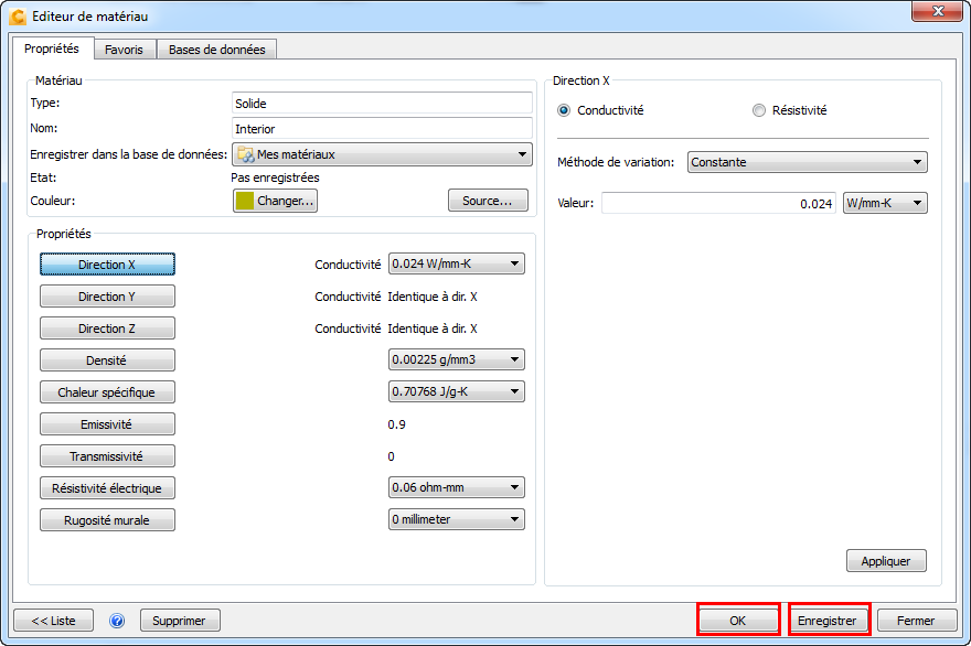 16. Pour enregistrer le nouveau matériau dans votre base de données de matériaux personnalisée, cliquez sur Enregistrer et sur OK dans l'Editeur de matériau.