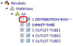 Par défaut, les pièces supprimées ne sont pas visibles pendant l'affichage des résultats. Pour les afficher, ouvrez la barre Etude de conception et développez la branche Matériaux de la branche Résultats. Cochez la case correspondant à chacune des pièces à afficher.