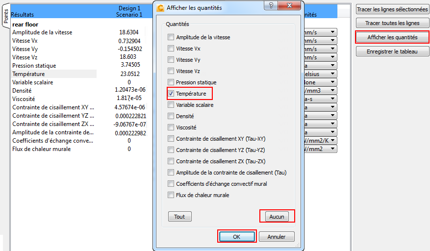 6. Pour afficher le résultat de température sur le point récapitulatif, cliquez sur Afficher les quantités. Dans la boîte de dialogue Afficher les quantités, cliquez sur Aucun, puis sélectionnez Température. Cliquez sur OK .