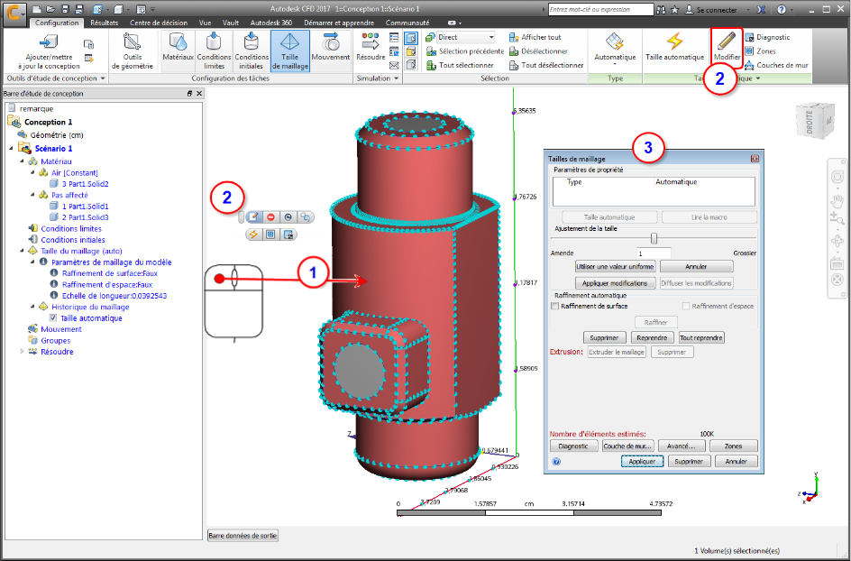 Servez-vous des outils de maillage pour personnaliser la distribution du maillage. Tous ces outils sont accessibles dans la boîte de dialogue d'édition rapide Tailles de maillage. Pour simplifier le processus de travail, de nombreux outils sont également disponibles dans la barre d'outils et le groupe de fonctions contextuel.