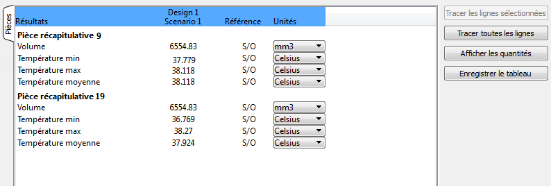 Les pièces de résultats sont idéales pour déterminer rapidement la température d'une pièce sélectionnée. Pour comparer les résultats provenant de plusieurs pièces, convertissez-les en pièces récapitulatives et visualisez leurs résultats dans l'onglet Valeurs critiques de la barre données de sortie.