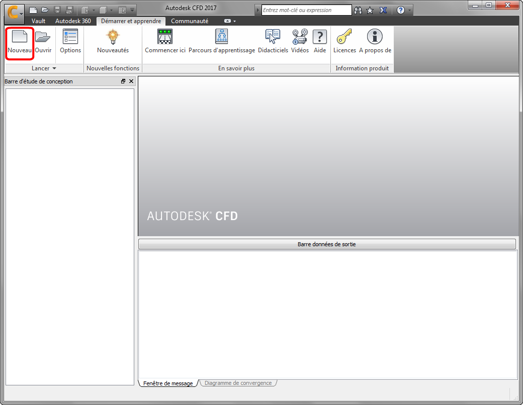 Autodesk® CFD démarre et crée l'étude de conception pour le didacticiel.