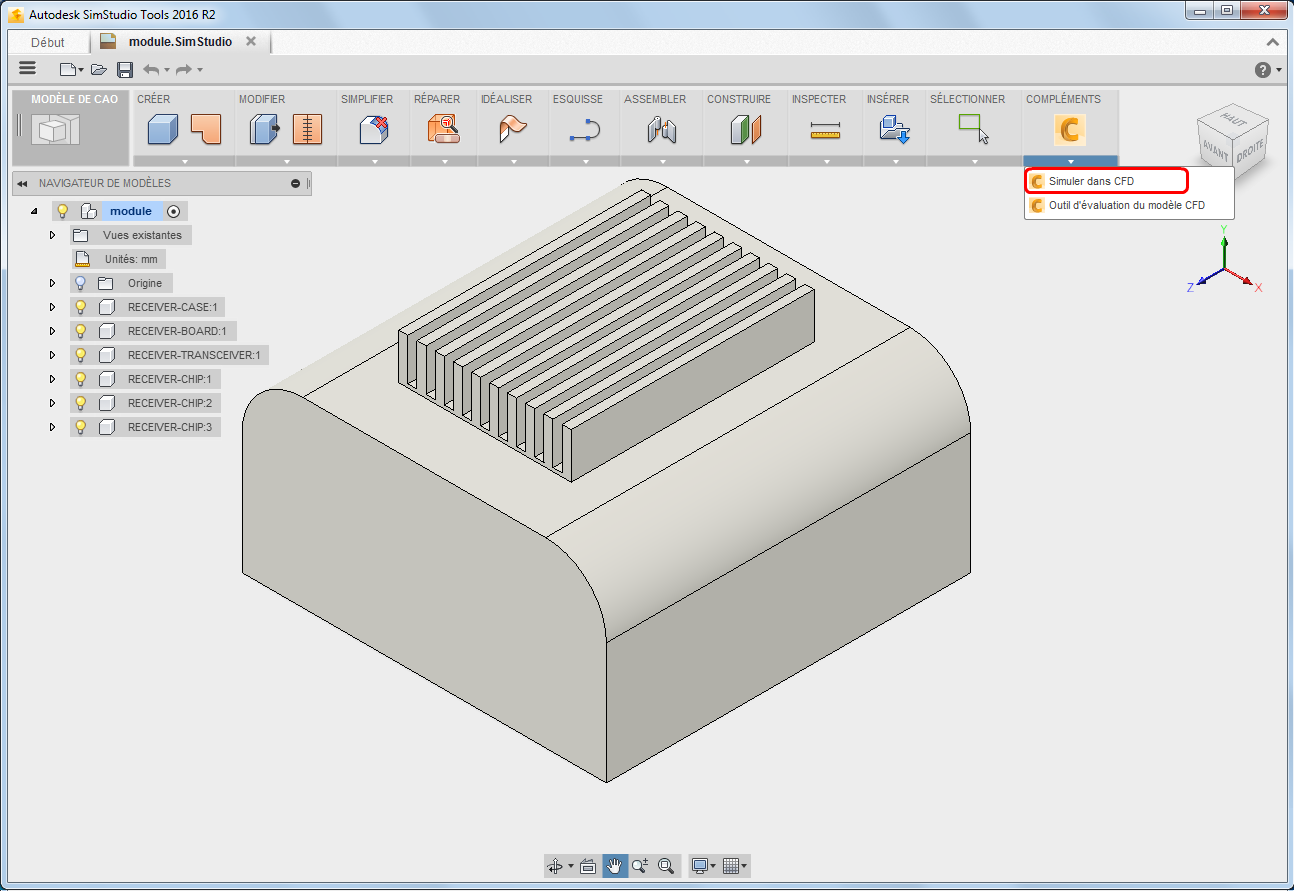Développez le menu Compléments, puis sélectionnez Simuler dans CFD.