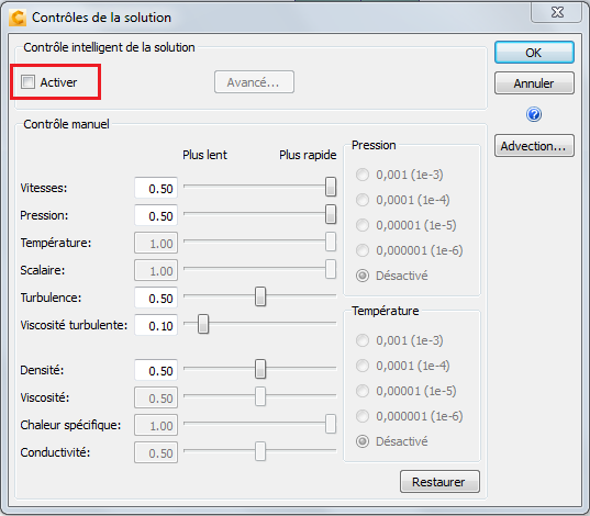 Dans la première étape de cette simulation, le contrôle intelligent de la solution est activé pour contrôler la progression de la convergence à l'étape stationnaire de l'analyse. A l'étape transitoire, vous devez désactiver le contrôle intelligent de la solution :