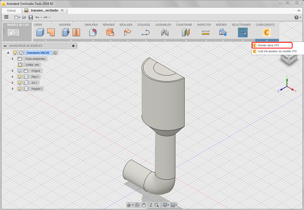 Développez le menu Compléments, puis sélectionnez Simuler dans CFD.