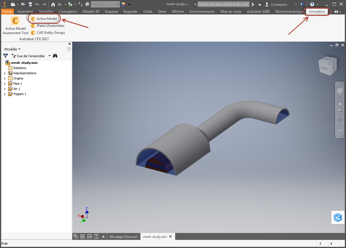 Par exemple, si vous effectuez le lancement à partir d'Autodesk® Inventor, cliquez sur Simulation, puis sur Modèle actif :
