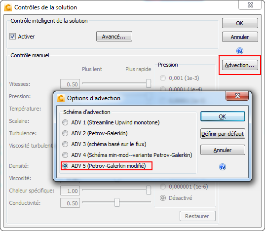 Cliquez sur le bouton Contrôle de la solution. Dans la boîte de dialogue Contrôles de la solution, cliquez sur Advection .... Dans la boîte de dialogue Options d'advection, sélectionnez ADV 5. Fermez les deux boîtes de dialogue.