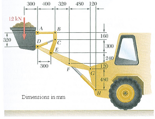 Given: The bucket of the front-end loader consists of two identical mechanisms. Each mechanism carries a load of 12 kN (24 kN total for the front-end loader) as shown in the figure below. Include the live load and gravity in the analysis.