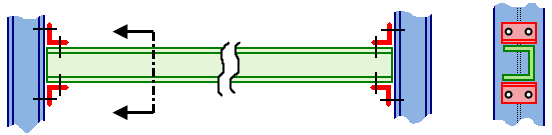 Consider a long channel used in a structure, and the interaction of the bolted connections at each end are to be studied in detail. So a CAD model of the beam, bolts, and connection is created. If the span of the channel is not of interest in the analysis, it can be replaced with a few beam elements to greatly reduce the size of the analysis. The Centroid Calculator automates the process of connecting each node on the cut end of the channel to the centroid, and then connecting the two centroids. See the following figure.