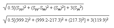Using the mean smoothing function and for smoothing after applying the operators (Smooth before applying operators is unchecked), the final result for the calculation of the von Mises stress would be the average of the two individual von Mises stresses, or 0.5*(1,555.9+992.0) = 1,273.9. For smoothing before applying the operators, the final result would be the von Mises equation using the mean value of the stress tensors, or