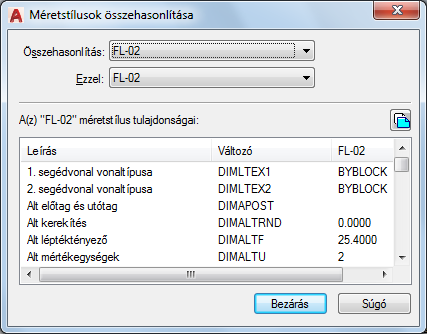 Megjeleníti a méretstílus-összehasonlítás eredményeit. Ha két különböző stílust hasonlít össze, akkor a különböző tulajdonságok jelennek meg. Ha az Ezzel értékét <nincs>-re állítja vagy az Összehasonlítás lista értékével megegyező értékre, a program a stílus összes tulajdonságát megjeleníti.