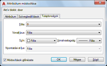 Megadja a fóliát, amelyen az attribútum bekapcsolt állapotú, és meghatározza az attribútum vonalának színét, vonalvastagságát és vonaltípusát. Ha a rajzban nyomtatási stílusokat használ, az attribútumhoz is rendelhet nyomtatási stílust a Tulajdonságok lapon.