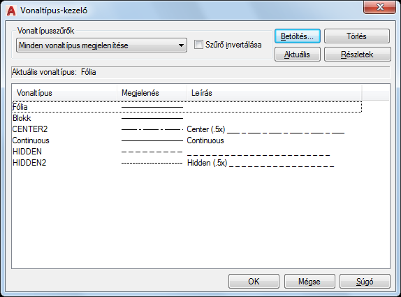 Megjeleníti a betöltött vonaltípusokat a Vonaltípus szűrőben meghatározott opciónak megfelelően. Az összes vonaltípus gyors kiválasztásához vagy törléséhez kattintson a jobb gombbal a vonaltípus listára a helyi menü megjelenítéséhez.