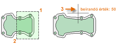 Használja a NYÚJT parancsot (vagy írja be az NY karaktereket a Parancs ablakba), és jelölje ki az objektumokat metsző kijelöléssel az alább látható módon (1 és 2). A metsző kijelölés kötelező – csak a metsző kijelölés által metszett geometriát nyújtja a program. Ezután kattintson bárhová a rajzban (3), mozgassa jobbra a mutatót, majd adja meg az 50 értéket a távolságként. Ez a távolság millimétert vagy lábat jelölhet.