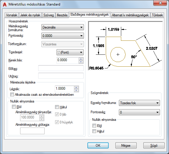 Az elsődleges mértékegységek formátumának és pontosságának beállítása, illetve elő- és utótagok hozzáadása a méretszövegekhez.