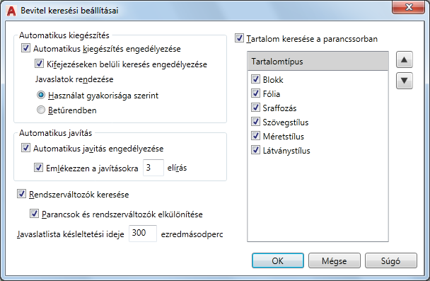 A parancsok, rendszerváltozók és elnevezett tartalmak, például blokkok és fóliák parancssori javaslatlistája megjelenítésének beállításait vezérli.