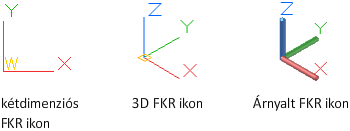 Az FKR ikon segítségével megjelenítheti a felhasználói koordináta-rendszer aktuális elhelyezkedését az aktuális nézetirány szerint. Ennek az ikonnak számos verziója érhető el, és megváltoztathatja a méretét, helyét és színét.