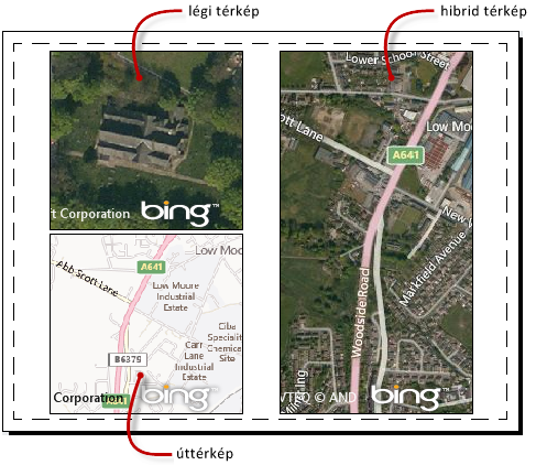 A térképet műholdfelvételként (légi stílusú térkép) vagy vektorképként (út stílusú térkép) jeleníti meg. A térképet a légi és az út stílusú képek keverékeként is megjelenítheti. Ha a rajzterület több nézetablakba van felosztva, akkor mindegyik nézetablaknak lehet saját térképstílusa.