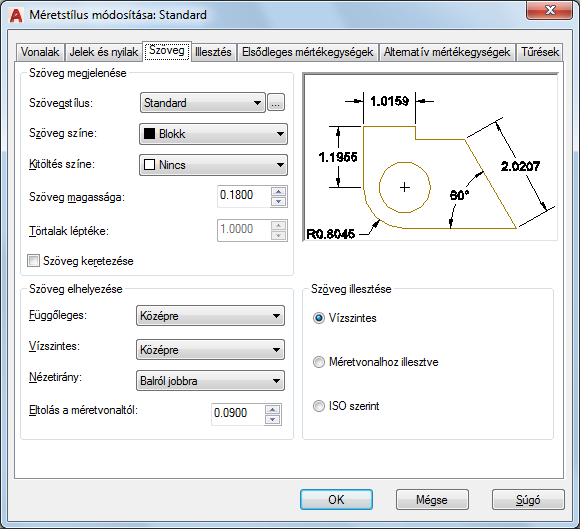 Ha a lapon megadott szövegstílus rögzített szövegmagassággal rendelkezik, akkor a magasság felülbírálja az itt beállított magasságot. Ha itt szeretné beállítani a méretszöveg magasságát, akkor a szövegstílusban megadott magasság értékét állítsa 0-ra. A szövegstílusok magasságának beállítására vonatkozó további részleteket lásd a STÍLUS parancsnál.