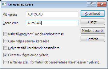 A Keresett szöveg mezőben megadott szöveg összes előfordulását megkeresi, és a Helyettesítő szöveg mezőbe írt szövegre cseréli le.