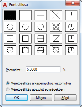 Beállítja a pont megjelenítési méretét. Az értékek lehetnek a képernyőhöz viszonyítottak vagy abszolút egységekben megadottak is. A pont megjelenítési méretét a PDSIZE rendszerváltozó tárolja. Az ezután megrajzolt objektumok az új értéket használják.