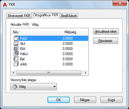 Felsorolja az aktuális rajzban definiált hat ortografikus koordináta-rendszert. Az ortografikus koordináta-rendszereket a Viszonyítás alapja listában meghatározott FKR-hez viszonyítva adja meg.