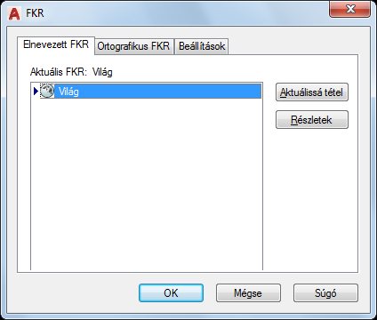 Felsorolja az aktuális rajzban definiált FKR-eket. Egy mutató jelzi az aktuális FKR-t.
