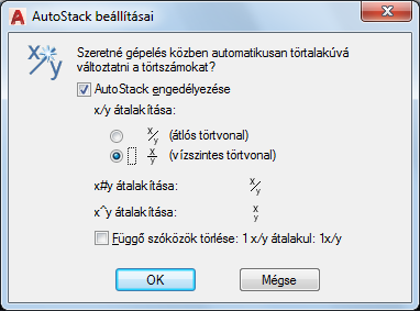 A perjelet (/) vízszintes törtvonallá konvertálja, ha az AutoStack lehetőség be van kapcsolva.