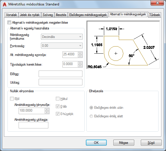 Meghatározza az alternatív mértékegységek megjelenítését a méretekben, és beállítja a formátumukat és pontosságukat.