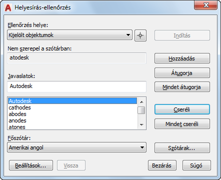 A helyesírás-ellenőrzést csak a kiválasztott egysoros szövegben, bekezdéses szövegben, méretszövegben, többszörösmutató-szövegben, blokkattribútum szövegében és xrefekben lévő szövegben hajtja végre.