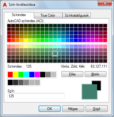 Szín megadásához választhat a 255-féle AutoCAD színindex (ACI) színek, a true color színek, valamint a Színkatalógus színek közül, amelyek három lapon érhetők el.