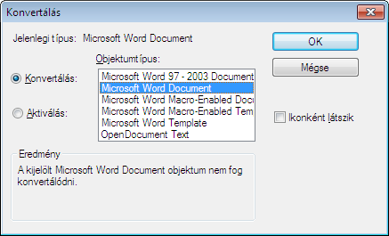 Az Objektumtípus területen megadott típusként nyitja meg a beágyazott objektumot, de a módosítás után visszatér az aktuális típushoz.