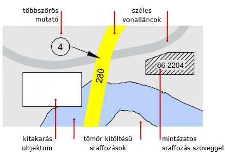 Vezérelheti a területeket fedő átfedő objektumokat, például a vastag vonalvastagsággal, széles vonalláncokkal, sraffozásokkal és kitöltésekkel, feliratozással és képekkel rendelkező objektumokat. A következő leképezés például több különböző típusú átfedő objektumot tartalmaz. Egyértelműen fontos ezen objektumok megjelenítésének és nyomtatásának sorrendje.