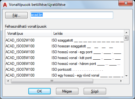 Megjeleníti az aktuális LIN-fájl nevét. Beírhatja egy másik LIN-fájl nevét, vagy kattintson a Fájl gombra egy fájl kiválasztásához a Vonaltípus fájl kiválasztása párbeszédpanelen.