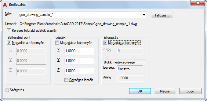 Megadja a beilleszteni kívánt blokk vagy rajz nevét és helyét.