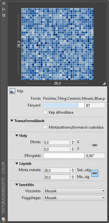 Kép vagy procedurális alapú textúrák tulajdonságait szerkeszti.