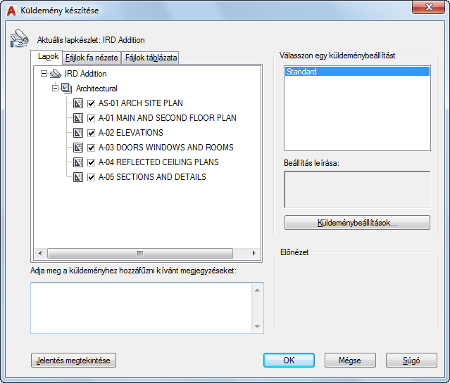 Jelentésinformációt jelenít meg, amely belekerül a küldeménycsomagba. Magában foglal minden beírt küldemény-megjegyzést, és tartalmazza azokat a program által automatikusan létrehozott disztribúciós megjegyzéseket, amelyek részletezik, hogy milyen lépések szükségesek a küldeménycsomag tökéletes működéséhez. Ha például SHX betűtípusok találhatók egy küldött rajzban, megjelenik egy útmutató arról, hova kell másolnia ezeket a fájlokat ahhoz, hogy azok a küldeményt telepítő számítógépen észlelhetők legyenek. Ha készült alapértelmezett megjegyzéseket tartalmazó szövegfájl, akkor a jelentés ezeket is tartalmazza.