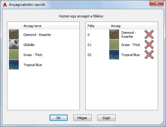 A rajz és a rajzhoz csatolt külső hivatkozások összes fóliáját felsorolja. Az anyagminiatűr megmutatja, melyik anyag van az adott fóliához társítva. A Törlés gombra (X jel) kattintva válassza le az anyagot a fóliáról.