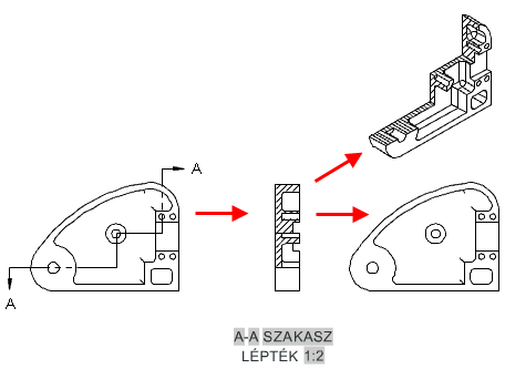 A modelldokumentációs metszeti nézet egy meglévő rajznézet vetített nézete, ahol a belső rész felfedése érdekében egy metszetvonalat használhat a rajnézet átvágásához.