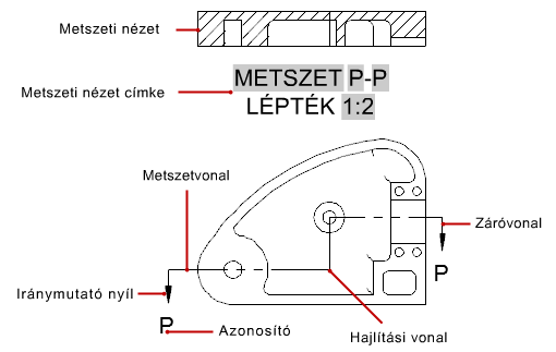 Az alábbi ábrák mutatják be a NÉZETMETSZET parancs által létrehozott különböző rajzelemeket, és a rájuk vonatkozó kifejezéseket. A metszetinézet-stílusok szabályozzák minden egyes felsorolt rajzelem megjelenését.