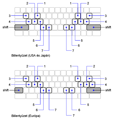 A következő ábrán található billentyűk az alapértelmezettek, de a billentyű-hozzárendelések szükség szerint megváltoztathatók és újak is hozzáadhatóak.
