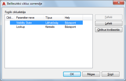 Megjeleníti a dinamikus blokkdefinícióban lévő fogók listáját. A Ciklikus oszlopban egy pipa jel mutatja, ha a fogó esetében be van kapcsolva a ciklikusság.