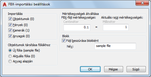 Megadja, hogy mit kell importálni, hogyan kell fóliákat rendelni az importált objektumokhoz, hogyan történjen a mértékegységek átváltása, blokként kell-e importálni az FBX-fájlt.