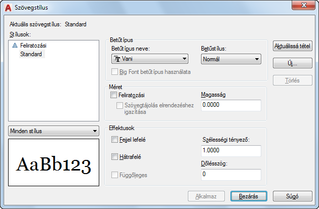 Megjeleníti a rajzban lévő stílusok listáját. A stílus neve előtti ikon azt jelzi, hogy a stílus feliratozási.