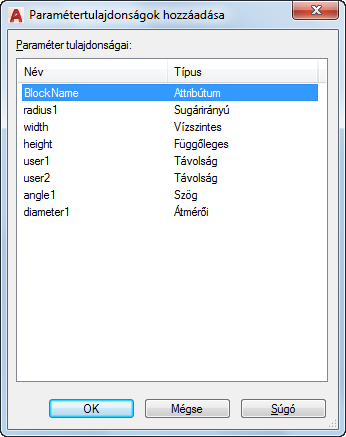 A blokk tulajdonságtáblájába felvehető paraméterek nevét jeleníti meg.